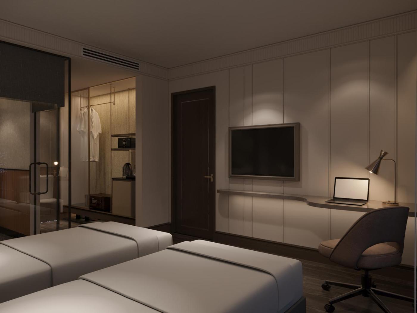 Premier Twin Room. Featuring free toiletries and bathrobes, this twin room includes a private bathroom with a bath, a shower and a bidet. The air-conditioned twin room features a flat-screen TV with streaming services, a minibar, a tea and coffee maker, a wardrobe as well as city views. The unit has 2 beds. ;